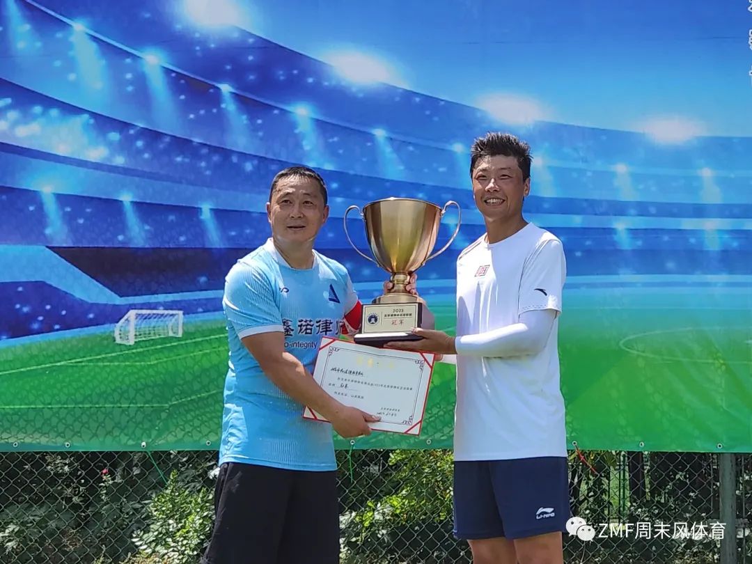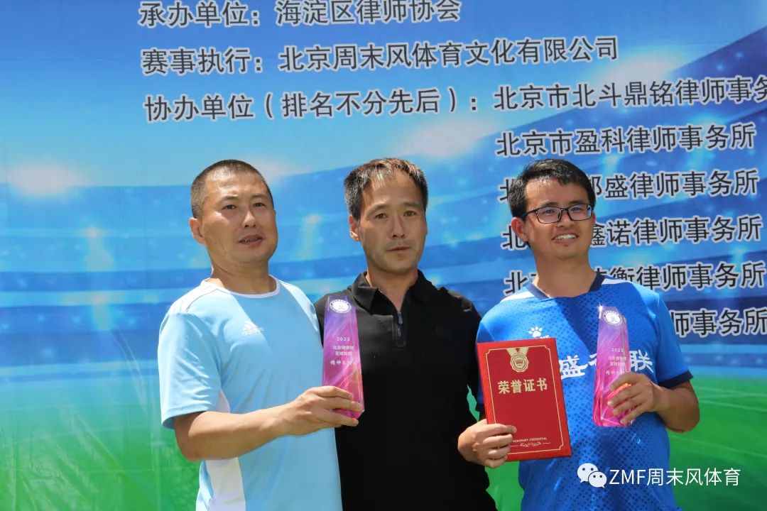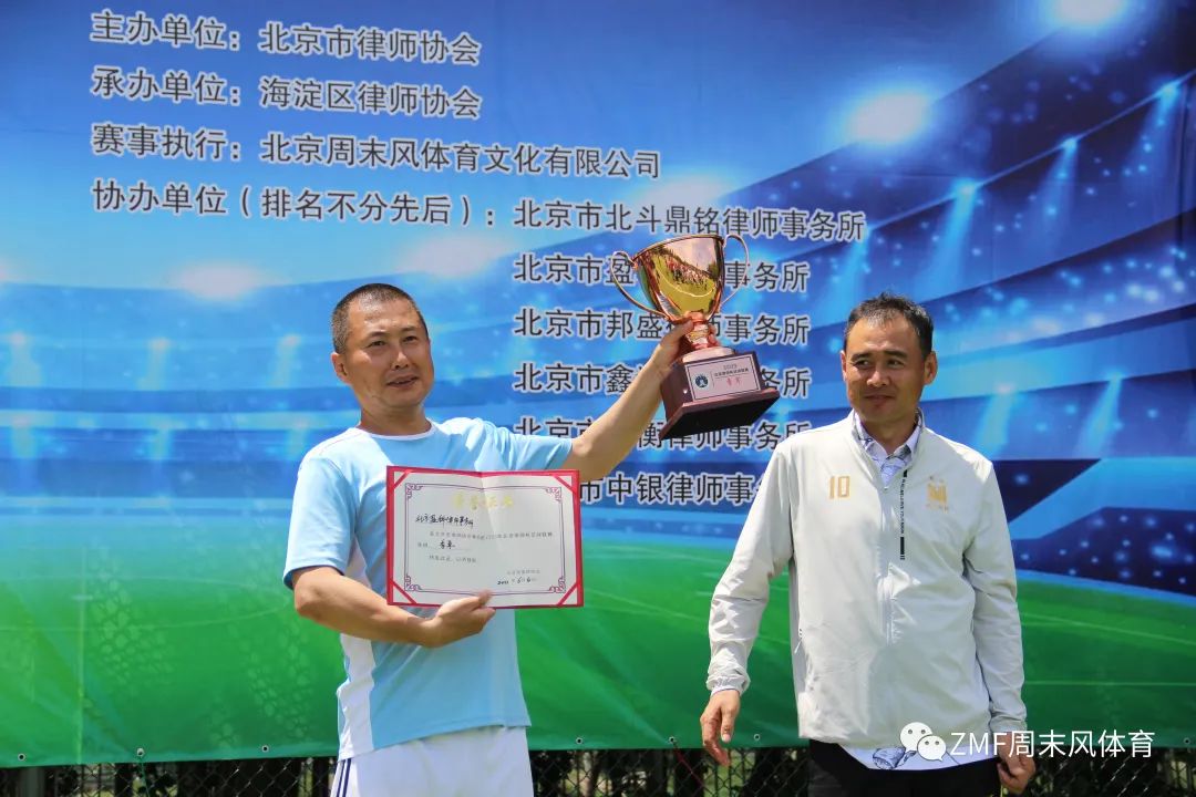 北京周末风体育文化有限公司总经理张勇,为北京市盈科律师事务所队代表、北京中银律师事务所队代表颁发精神文明奖奖杯及证书