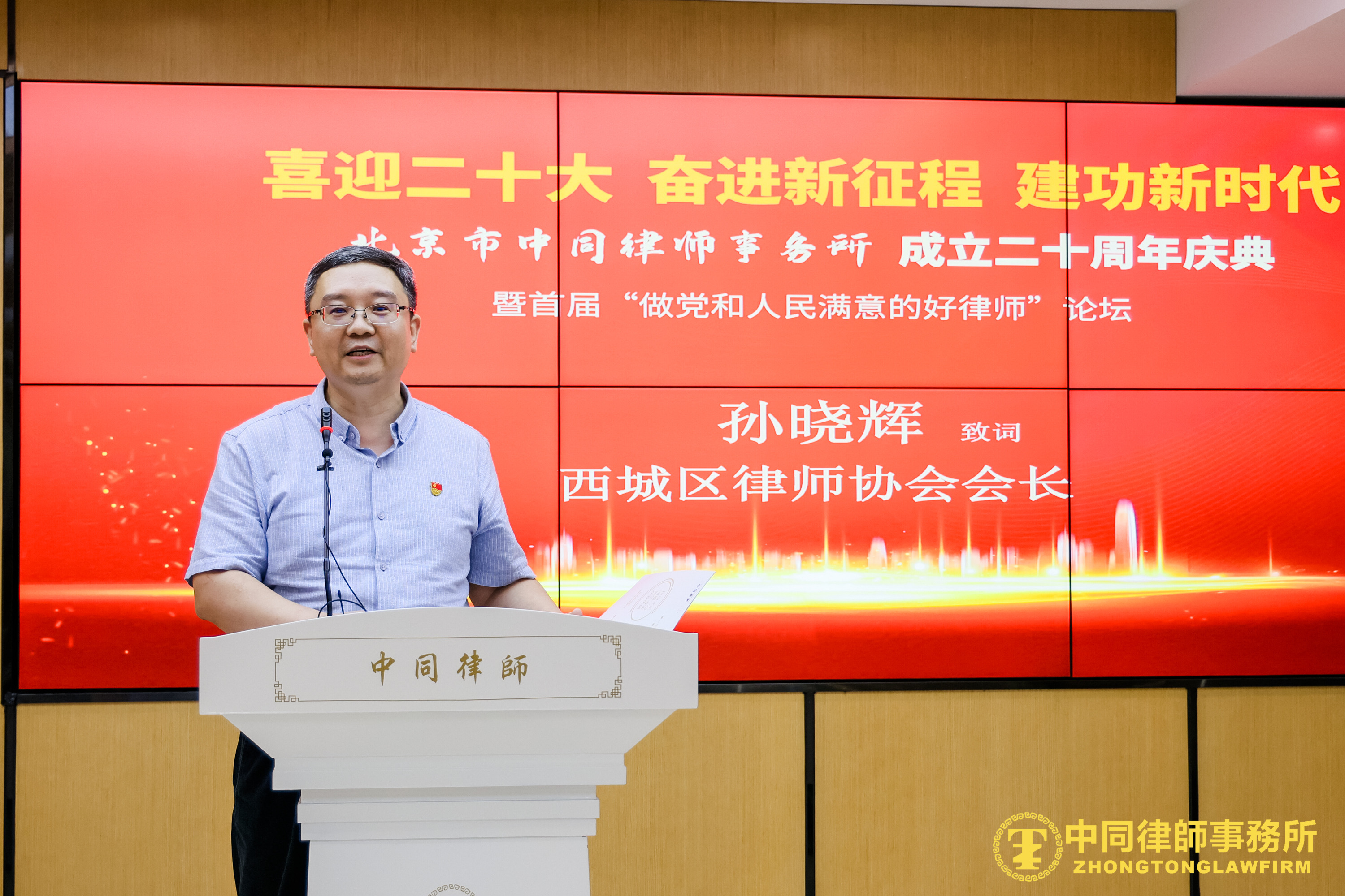 随后,西城区律师协会会长孙晓辉发表了热情洋溢的致辞,他首先代表协会对中同所成立二十周年表示热烈祝贺,他讲到中同所特别是杨矿生主任多年来深入参与区律师行业发展建设的重要作用和贡献,并从协会和同行的视角,阐述了对中同所“清正、专业、开放、文化”四个方面的深刻印象。最后,孙晓辉会长对中同所提出了进一步加强党建促所建、努力成为行业高质量发展标杆、积极履行社会责任践行人民律师使命的发展期望。