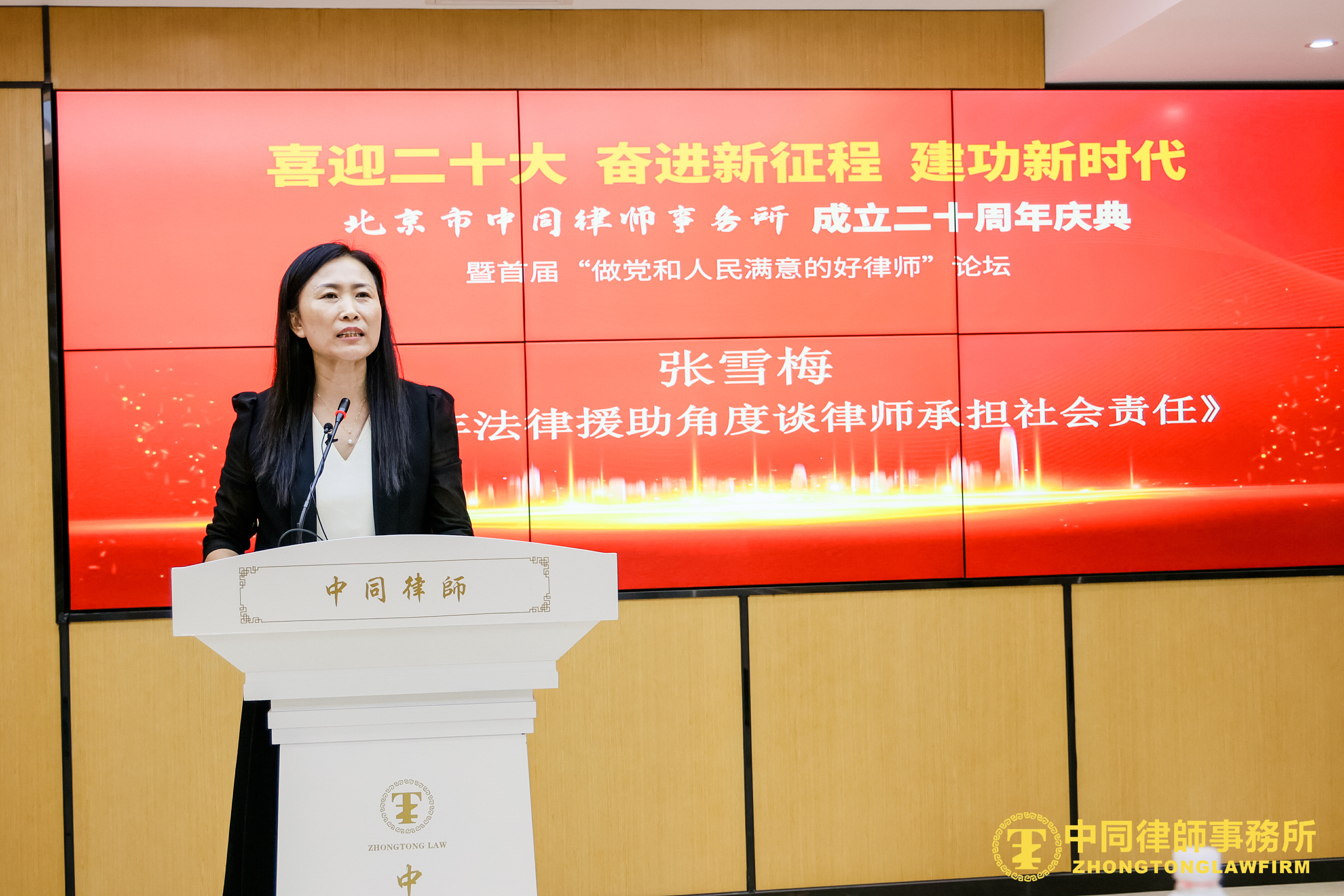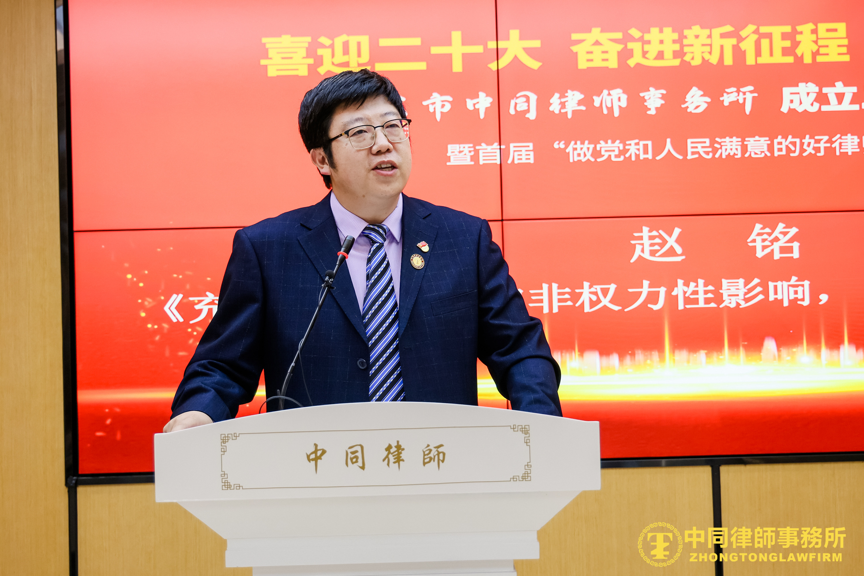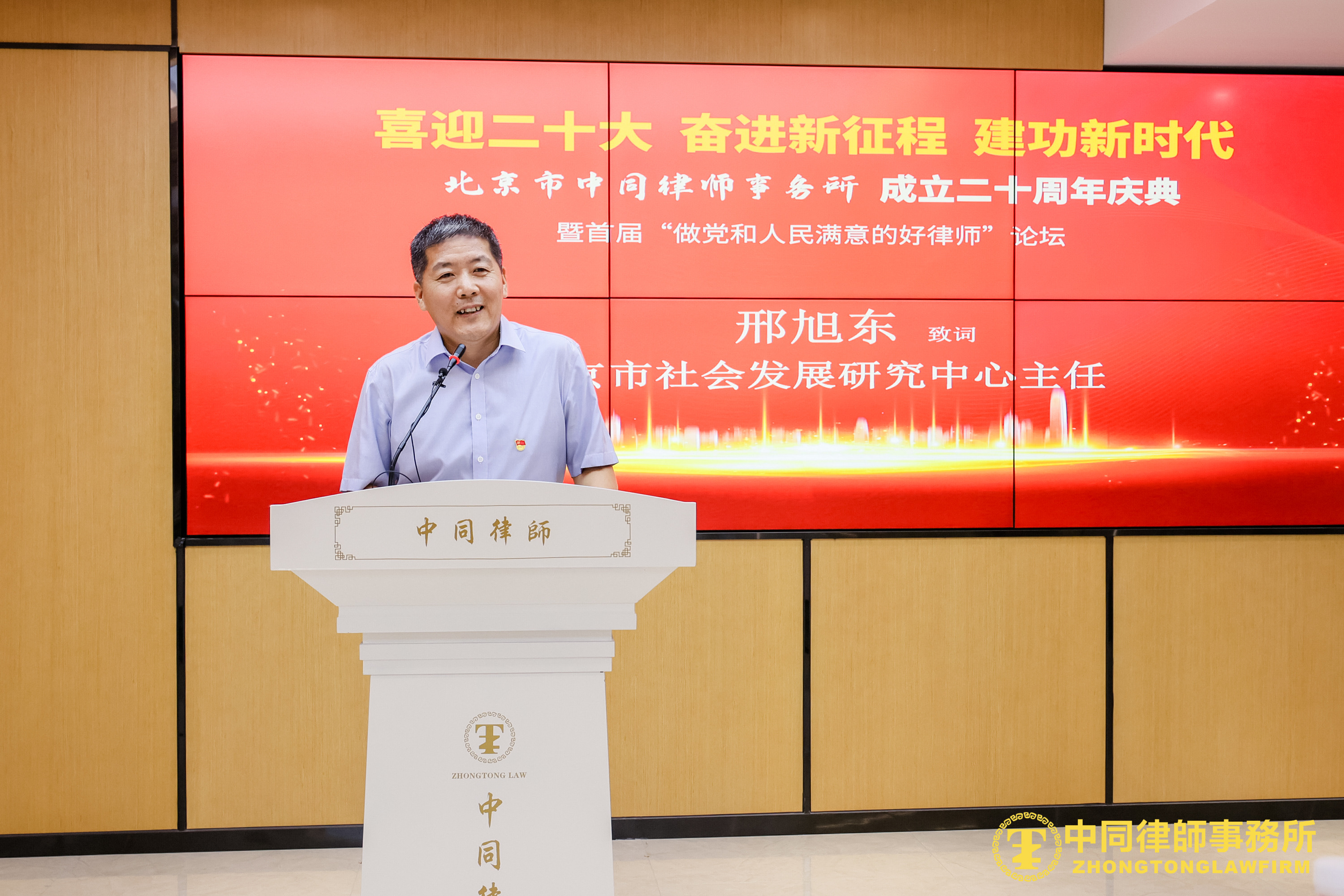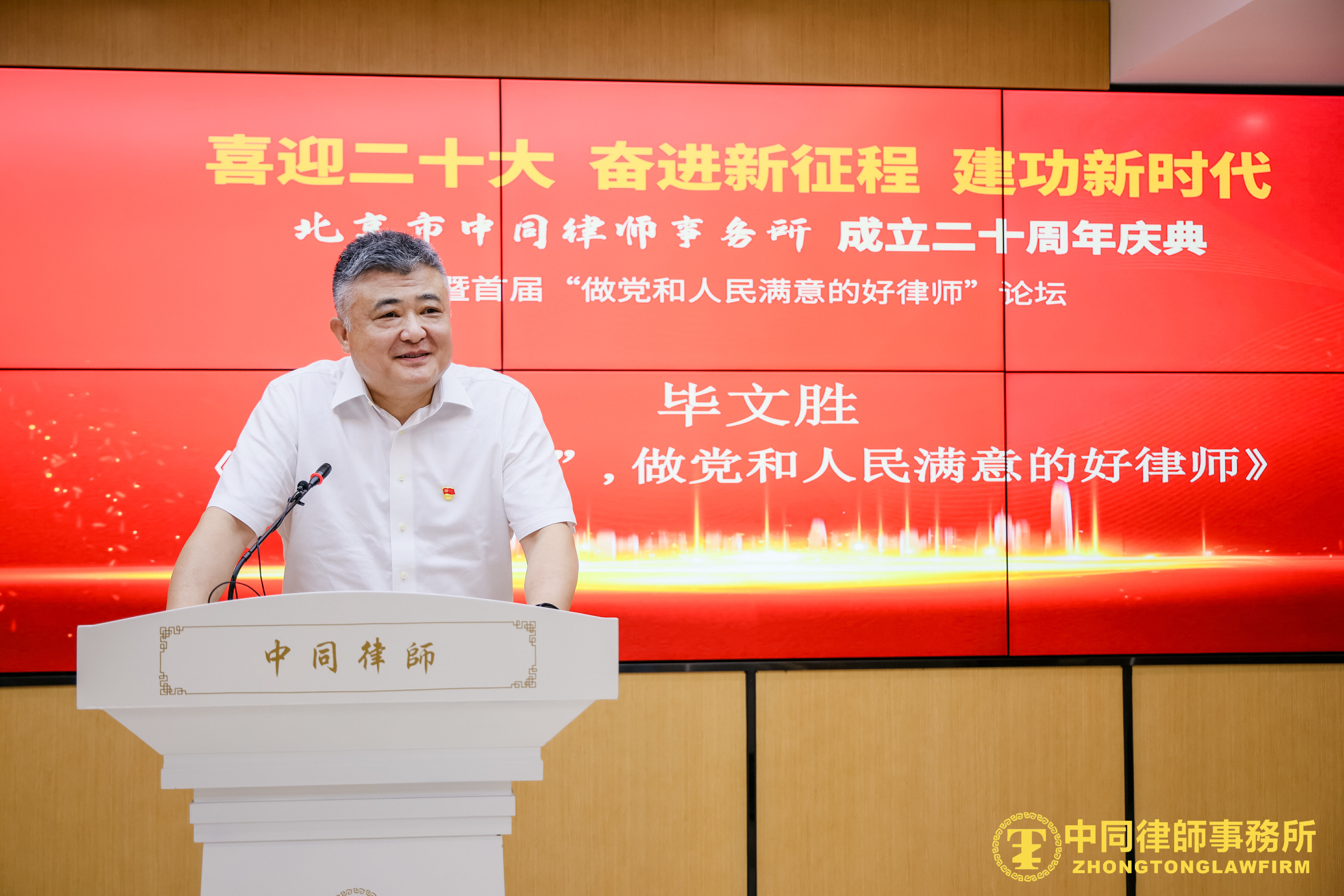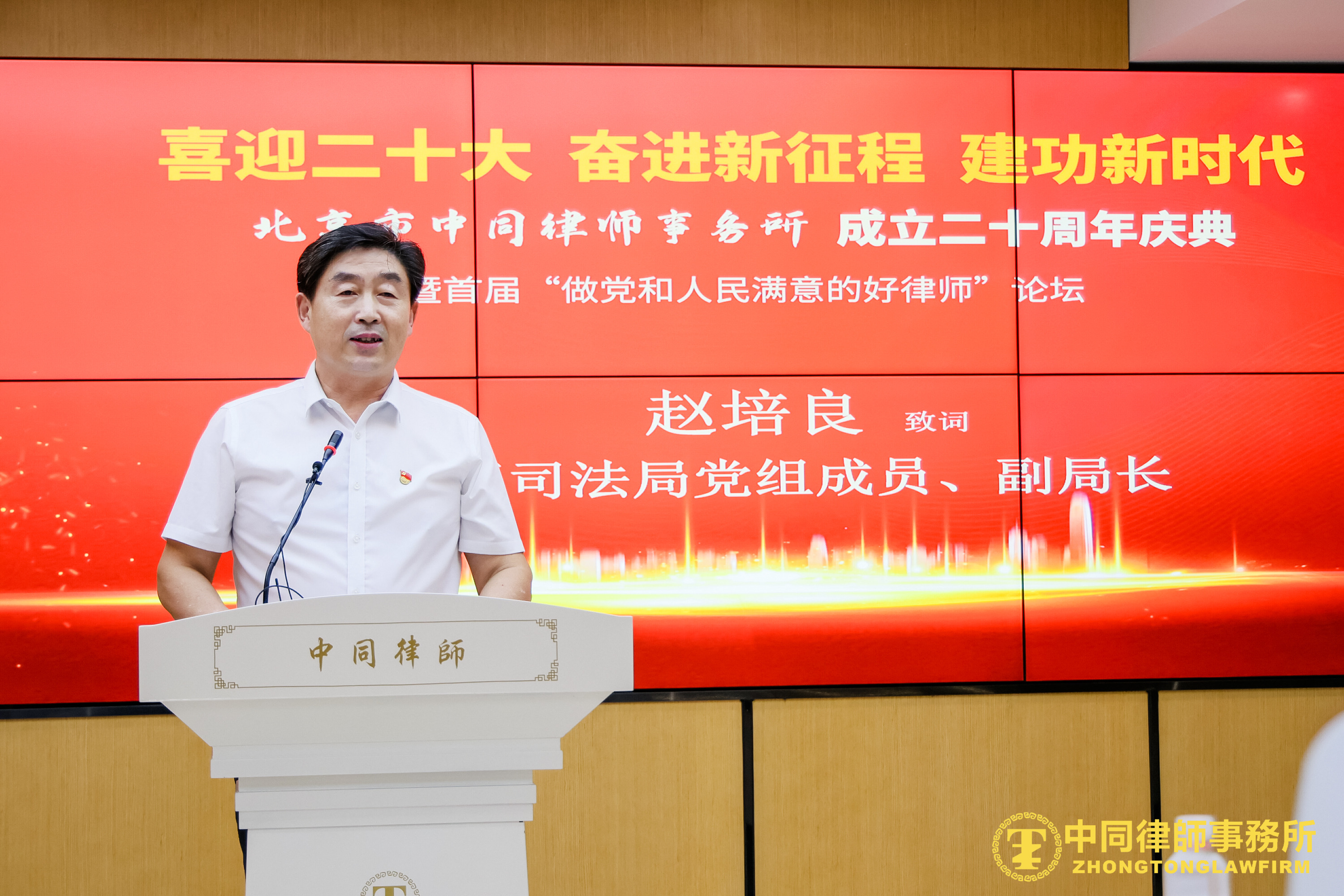 紧接着,西城区司法局党组成员、副局长赵培良代表西城区司法局对中同所成立二十周年以及已取得的辉煌成就表示热烈祝贺,对中同所20年来对区司法局、行业协会、党委各项工作的支持表示了衷心的感谢。赵培良副局长在致辞中指出,中同所凭借专业高效的法律服务,得到了社会各界的认可,尤其是在公益法律服务方面取得了良好社会效果。希望中同所在未来,立足北京,放眼全国,以更加主动的担当意识,持续加强党的建设、律师队伍建设、业务建设、律所文化建设和公益法律服务,在中华民族伟大复兴新征程中贡献自己的力量。