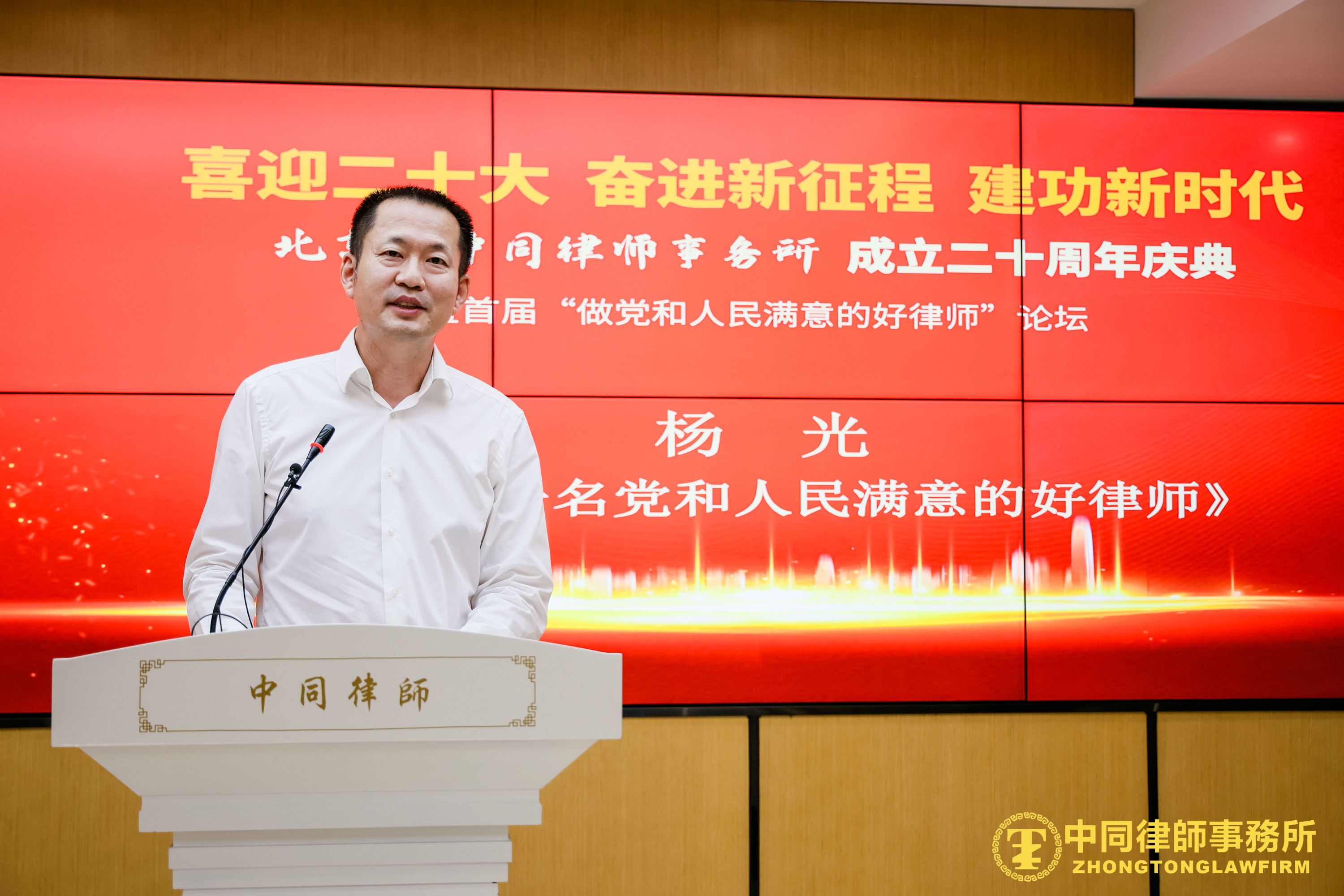 北京市朝阳区律师协会会长、北京市兰台律师事务所创始合伙人杨光以《如何做一名党和人民满意的好律师》为题,进行了主题发言。他从律师维护公平正义、提供具有实践价值的法律建议的职责入手,阐述了其对“如何做一名党和人民满意的好律师”的理解,总结了当代律师具有政治性、时代性、地域性、专业性、独立性五个特点,提出律师忠实于法律,追求公平正义,才能做一名党和人民满意的好律师。