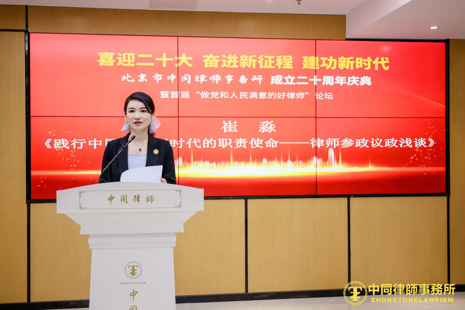北京市西城区政协委员、中同所合伙人崔淼律师以《践行中国律师新时代的职责使命——律师参政议政浅谈》为题,介绍了新中国成立以来律师职业定位的变化。在新时代,律师被定位为中国特色社会主义法治工作者,这对律师队伍建设和行业发展提出了新的要求和目标。同时,崔淼律师也详细阐述了律师参政议政的优势、应当承担的职责以及自身参政议政的感悟,寄语年轻律师心怀国之大者,积极参政议政,为实现中华民族伟大复兴的中国梦贡献智慧和力量!