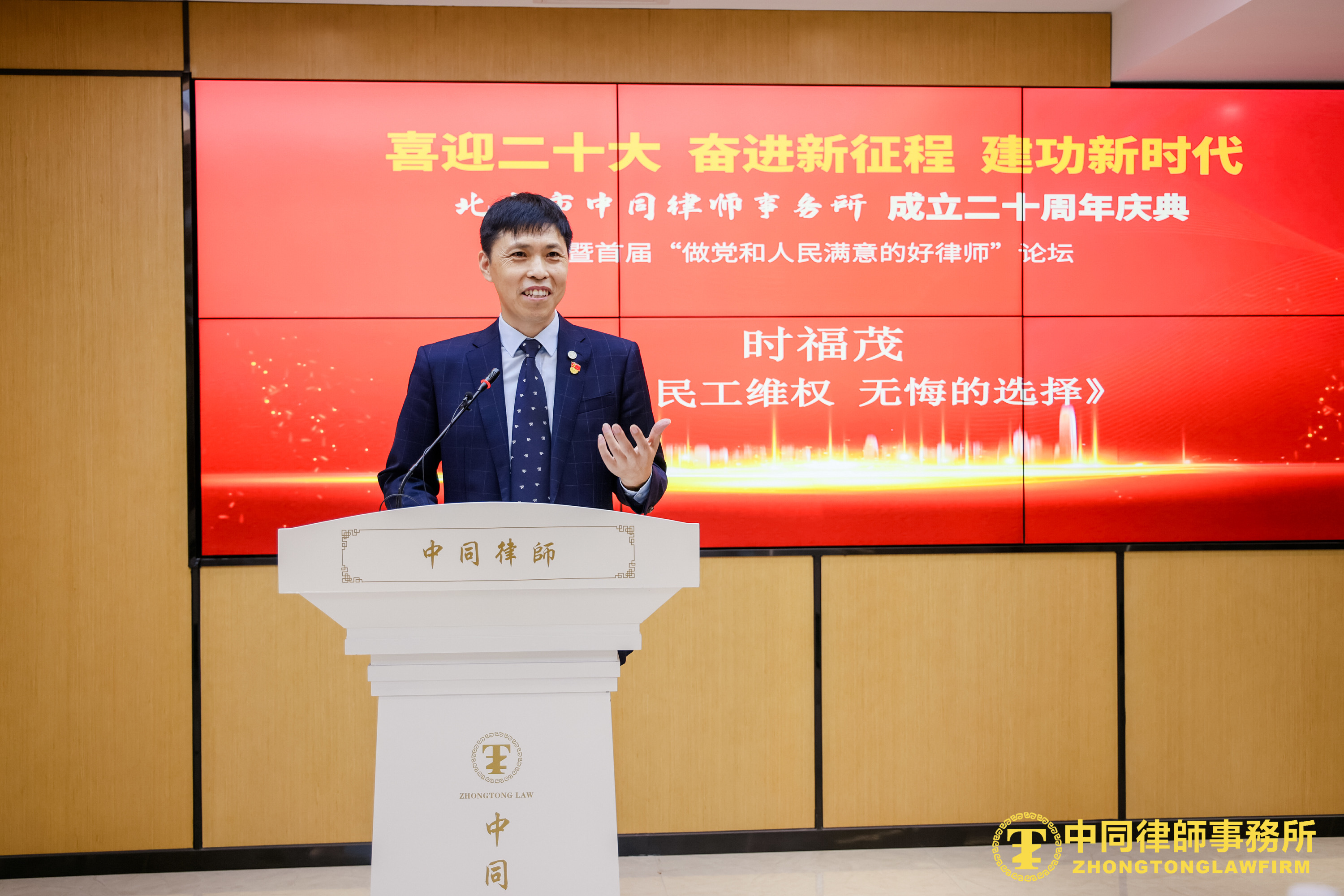 北京福茂律师事务所主任时福茂以《为农民工维权 无悔的选择》为题,从自身的成长经历出发,谈到自身在农民工维权工作中的经历、感悟以及农民工维权工作的意义与收获。最后时福茂律师以“中国律师有方向,同心同德聚力量。真情奉献二十年,美好未来一起创!”的藏头诗表达了其对中同所成立二十周年的热烈祝贺。