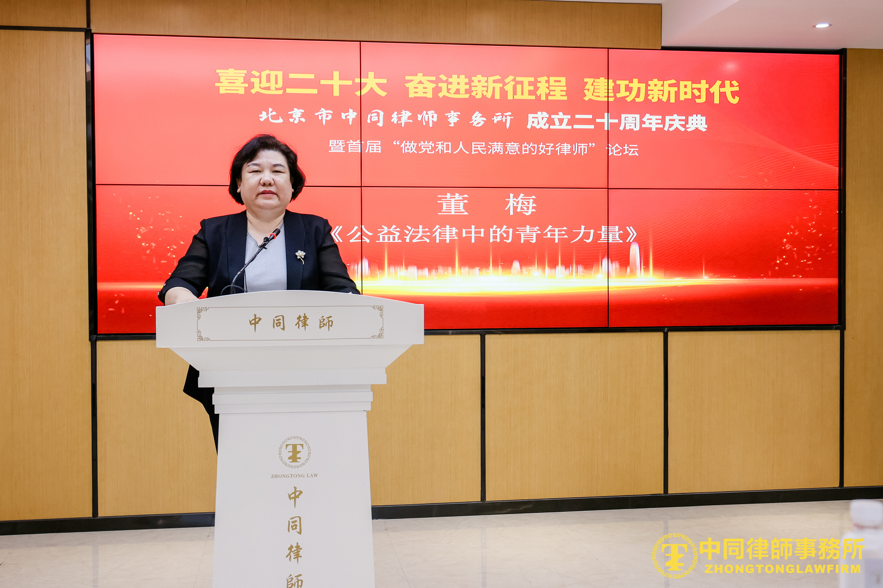 北京市炜衡律师事务所高级合伙人董梅以《公益法律中的青年力量》为题,以散文诗式描绘了其去年7月1日与欧阳继华律师在天安门广场参加建党百年庆典时的情景,抒发了其与欧阳继华律师的缘份以及共同的价值追求理念,阐述了公益法律服务的难点、公益法律服务对青年律师职业成长的帮助以及公益法律服务对律师行业发展的意义。最后董梅点出青年律师投身公益法律服务事业的优势,鼓励广大青年律师积极投身于中国公益法律服务事业。