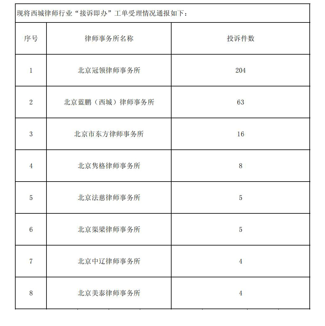 西城律师行业“接诉即办”工单受理情况通报(2025年12月)