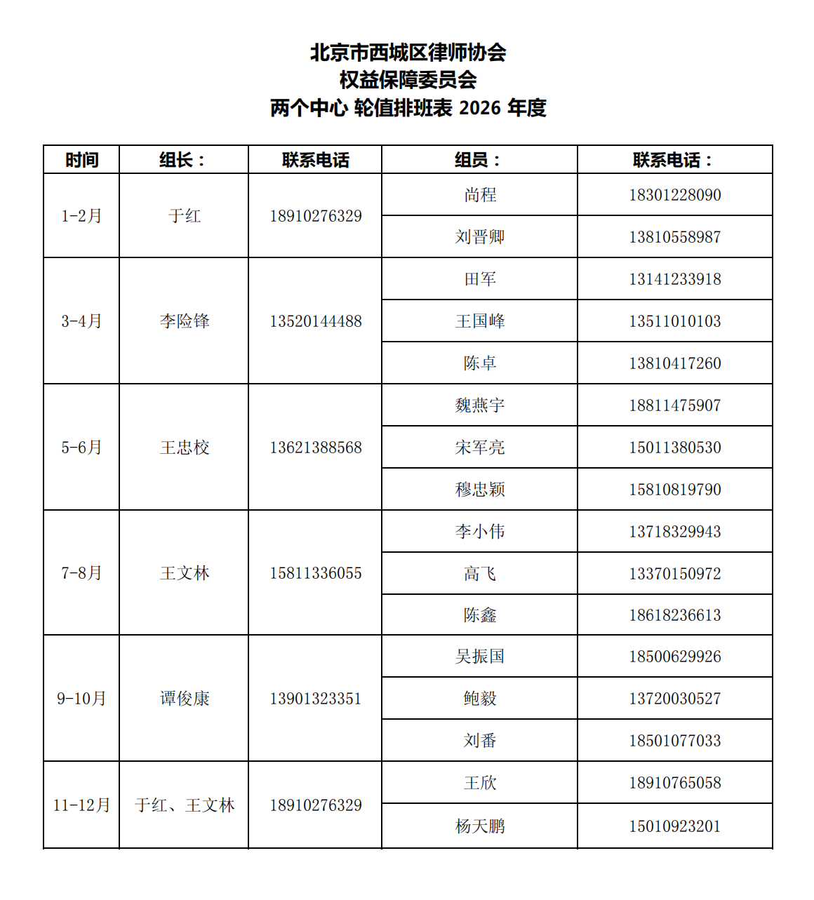 为进一步畅通律师维权渠道,保障律师执业权利,西城区律协维权中心现将2026年度值班表予以发布。各位律师同仁在执业过程中遇到执业权利受到妨碍、侵害等符合《律师权保手册》所载维权条件的情形时,可及时与值班人员联系,依法依规提出维权申请,以期共同维护西城区律师行业健康发展。