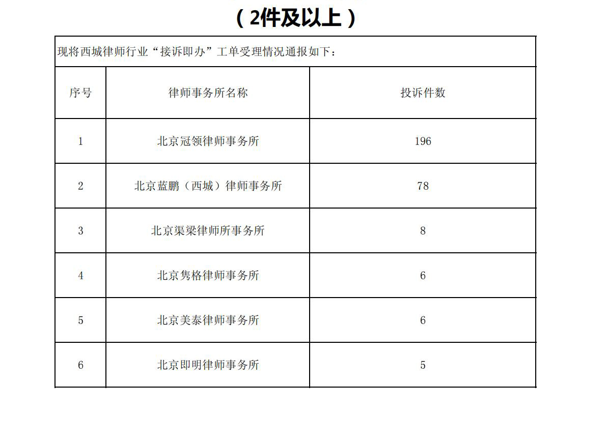 西城律师行业“接诉即办”工单受理情况通报(2025年11月)