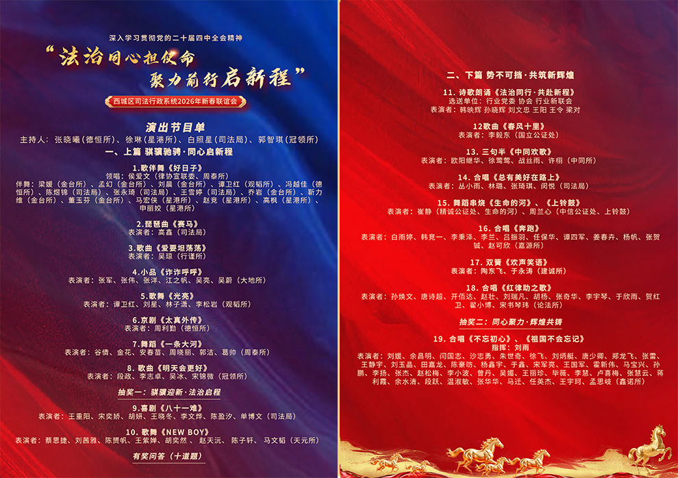 演出环节精彩纷呈,分为“骐骥驰骋·同心启新程”与“势不可挡·共筑新辉煌”上下两个篇章。节目全部由区司法局、公证处、各律师事务所选送,形式多样,内容丰富。活动中穿插紧扣“党的二十届四中全会精神”的有奖问答,现场观众踊跃参与,气氛热烈。活动在《不忘初心》与《祖国不会忘记》的激昂合唱中圆满落下帷幕。