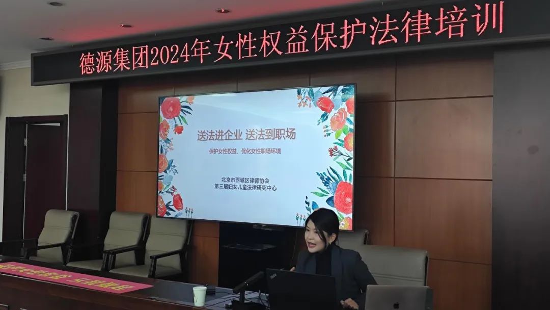 2024年3月4日,为迎接即将到来的“国际妇女节”主题,为西城区企业女职工们与时俱进、强化女性的自我法律保护意识、维权意识,“送法进企业、送法到职场”活动在西城区企业北京德源兴业投资管理集团有限公司举行。女工委委员兼妇女儿童法律研究中心研究员葛瑶律师,围绕《中华人民共和国妇女权益保障法》以及新时代女性的劳动权益保护、防止职场性骚扰、反家庭暴力等话题,为德源集团及其下属集团子公司的员工们作普法讲座。