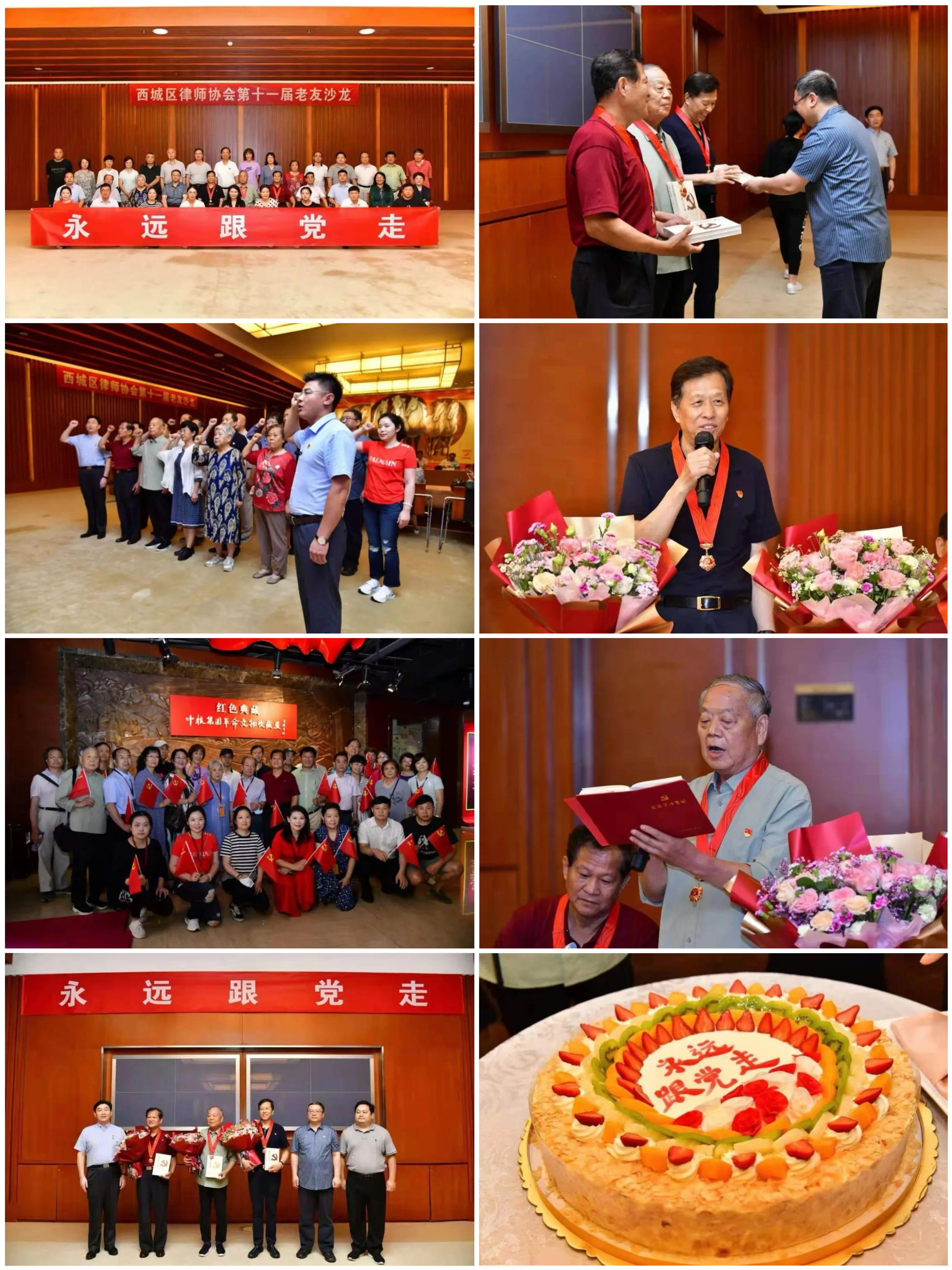 2021年的老友沙龙活动,主题定为“永远跟党走 西城律协第十一届老友沙龙”。整个活动始终贯穿着行业党建健康、持续、高质量发展的精神。本次活动,除了领导的讲话外,还有几个亮点。例如,在欧阳继华副会长的引领下,全体新老党员律师肃立在党旗前,共同重温入党誓词;为在党服务50年的党员律师代表颁发纪念章;老党员们分享心得,有的即兴编诗朗诵,有的演唱革命歌曲,有的分享入党故事,回忆峥嵘岁月,庆祝百年华诞,表达听党话、感党恩、跟党走的决心。此外,我们还组织参观了红色典藏革命文物收藏展,以更丰富、直观、生动的方式展示了中国共产党革命历史的波澜壮阔。在党史教育的接受过程中,参观者更加坚定了信念,接受了思想的洗礼。最终,全体成员共同唱响《没有共产党就没有新中国》,在歌声中圆满结束了本届老友沙龙。