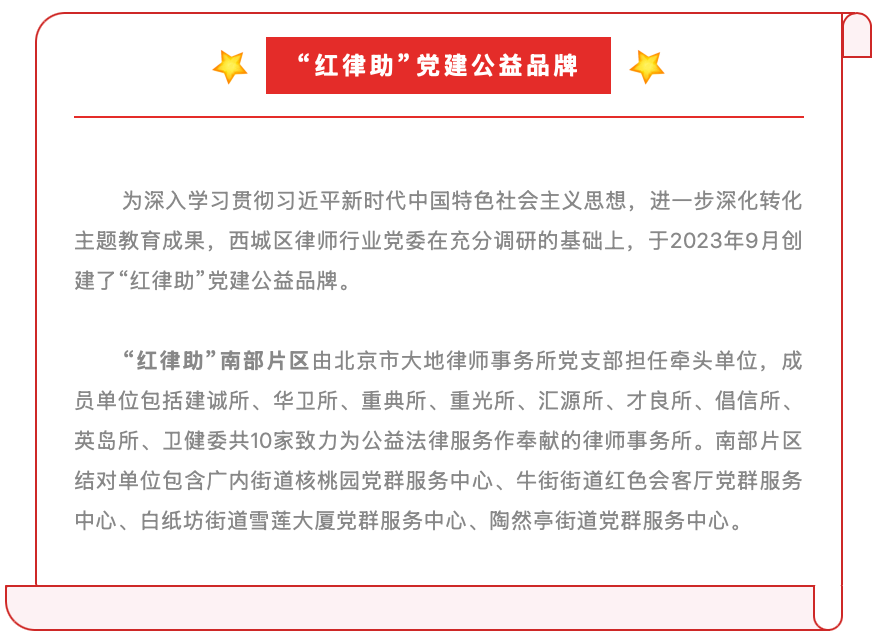 长期以来,由北京市大地律师事务所牵头的“红律助”南部片区始终深耕社区一线,把专业法律服务与居民实际需求紧密结合。团队一方面通过常态化普法宣传,帮助居民补齐法律知识短板、消除法律认知误区;另一方面提供精准高效的法律服务,切实解决群众身边的各类法律难题,为片区基层治理夯实法治基础,让法治力量真正融入日常、温暖民心。
